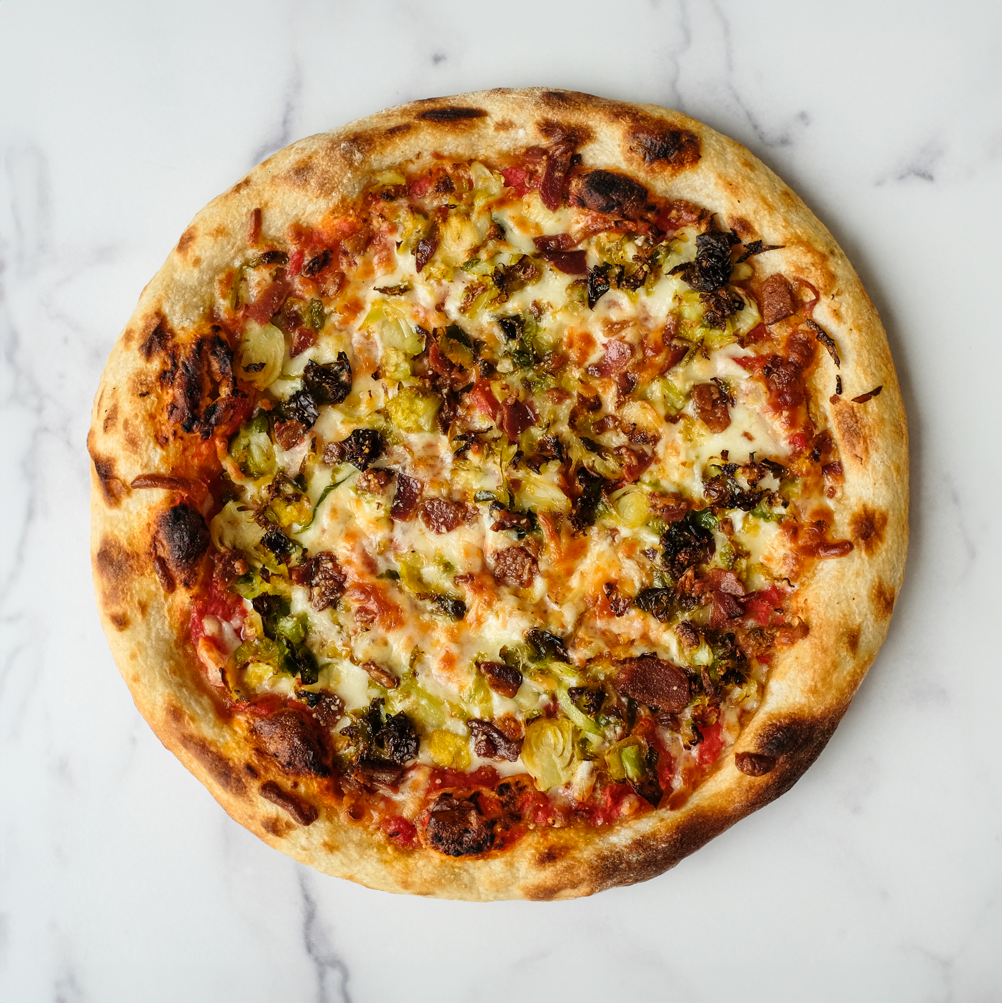 Flour (wheat flour, malted barley flour, niacin, reduced iron thiamine mononitrate, riboflavin, folic acid), Water, Tomatoes (plum tomatoes, tomato juice, fresh basil leaf, salt, citric acid), Mozzarella (pasteurized milk, cheese culture, salt, enzymes), Brussels Sprouts, Bacon (pork, cured with: water, sea salt, sugar, cultured celery powder), Parmigiano Reggiano (milk, salt, rennet), Olive Oil, Salt